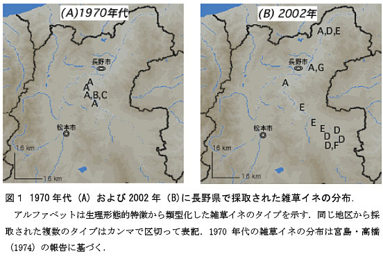 雑草イネは、1970年代には善光寺平に分布していたが、2002年には善光寺から約30km離れた広範な地域に分布する(図1)。 |
