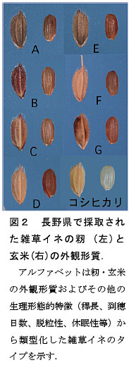 長野県において近年発生する雑草イネは、1970年代に発生した雑草イネよりも短稈で、出穂が早く、休眠性の深いタイプが優占し、1970年代よりも広範な地域に分布する。これらの雑草イネは全て日本型の赤米である。 |