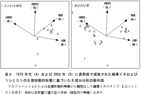 1970年代に優占的であったタイプAと、2002年に優占的であったタイプD, Eは、いずれも自然脱粒する特徴を持つ。これらの稈長と出穂期をコシヒカリと比較すると、タイプAは約20cm長稈で同時期、タイプD, Eは約10cm長稈で1週間程度早生である。またタイプD, EはタイプAよりも休眠性が深い(図3)。 |