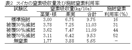 [キーワード]スイカトンネル栽培、窒素減肥、窒素全量基肥、被覆肥料、土壌残存窒素量 |
