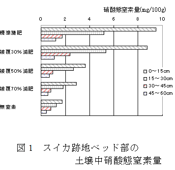 跡地ベッド部の土壌中硝酸態窒素量は、標準施肥区に比べて、50%及び70%減肥区 では60%程度減少するが、30%減肥区では同程度残存する(図1)。 |