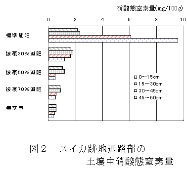 跡地通路部の土壌中硝酸態窒素量は、標準施肥区が30~60cm層で6.1~9.6mg/100g と多いのに対して、各減肥区では2mg/100g以下と少ない(図2)。 |