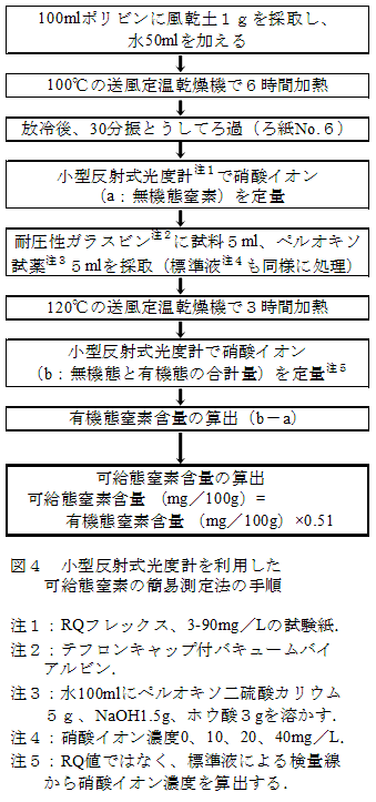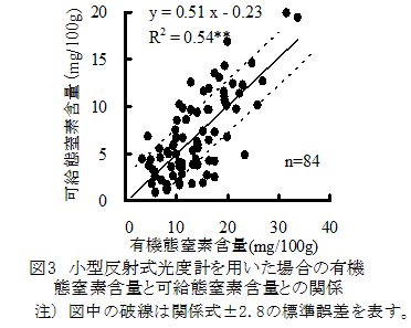 畑土壌を100℃で6時間煮沸浸出した溶液から有機態窒素含量を求める煮沸浸出法は、小型反射式光度計を利用して迅速に可給態窒素含量を推定できる。 | ||||||||||