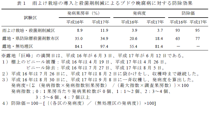 ブドウ樹上にビニールを被覆する雨よけ栽培を導入することで、「展葉2~3枚期」、「開花終期」、「果粒小豆粒大~果粒大豆粒大期」のブドウ晩腐病への殺菌剤の散布を省略(約30%削減)できる。 |