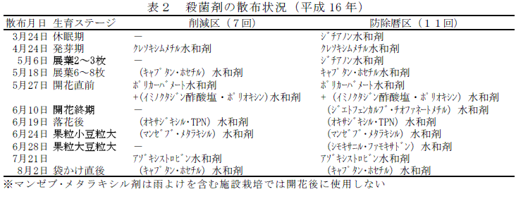 雨よけ栽培ではビニールを被覆している期間は施設栽培とみなされるため、マンゼブ剤の開花後の散布はできない。 |