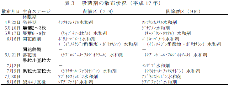 [キーワード]ブドウ、雨よけ栽培、巨峰、病害虫防除暦、殺菌剤、晩腐病、散布回数 |