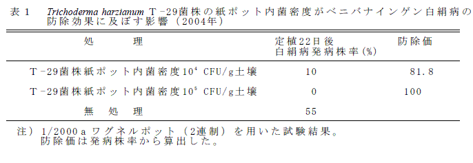 トリコデルマ菌の拮抗性菌株の胞子資材を市販園芸培土に混和して紙ポットに詰め、ベニバナインゲンを播種・育苗して移植するとT-29菌株は白絹病に、T03890菌株はリゾクトニア根腐病に対して防除効果を示す。 |