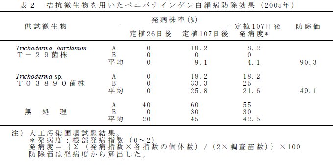 白絹病に対する圃場試験では、定植107日後における無処理区の発病度が43.4であるのに対し、T-29菌株処理区の発病度は4.1(防除価90.3)と低く、極めて高い防除効果を示す。しかし、T03890菌株処理区の発病度は21.6(防除価49.1)となり、防除効果はやや劣る(表2)。 |