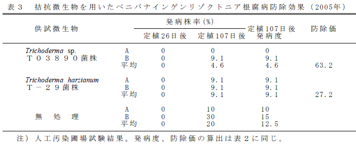 リゾクトニア根腐病に対する圃場試験では、定植107日後における無処理区の発病度が17.5であるのに対し、T03890菌株処理区の発病度は4.6(防除価63.2)と低く、高い防除効果を示す。しかし、T-29菌株処理区の発病度は9.1(防除価27.2)と防除効果は低い(表3)。 |