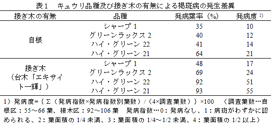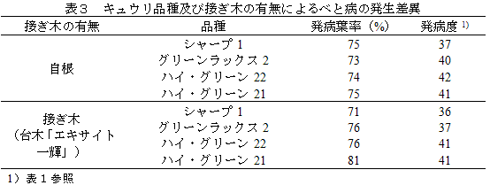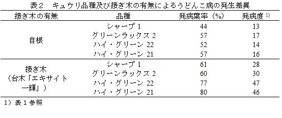 キュウリ褐斑病、うどんこ病及びべと病の発生に及ぼす接ぎ木の影響と品種間差異 | ||||||||||