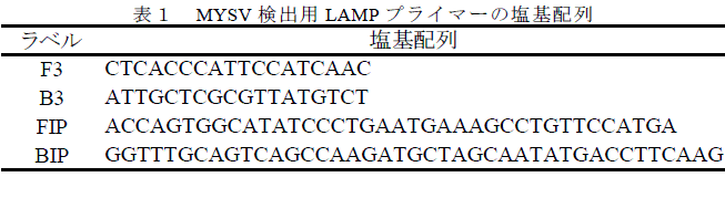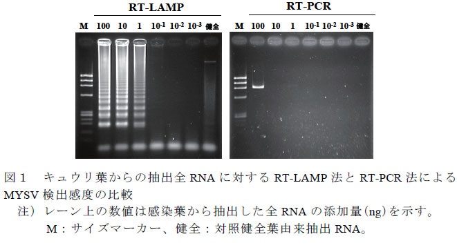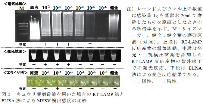 RT-LAMP法を用ることで、キュウリ黄化えそ病ウイルス(MYSV)をELISA法及びRT-PCR法より高感度かつ簡易に検出できる。 | ||||||||||
