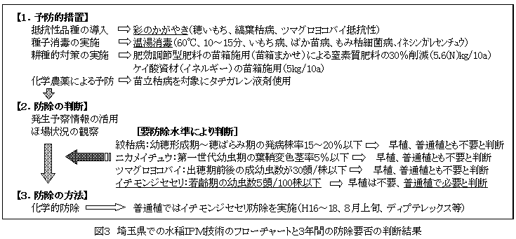 埼玉県において病害虫複合抵抗性品種、温湯消毒、肥効調節型肥料の苗箱施用(苗箱まかせ)、ケイ酸資材(イネルギー)、要防除水準に基づいた化学的防除を組合せることで、水稲IPMの概念の活用による減農薬、減化学肥料栽培ができる。 | ||||||||||