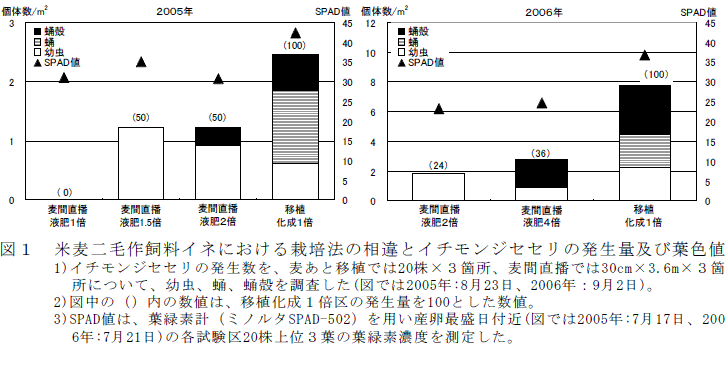飼料イネの麦間直播は窒素多用栽培でもイチモンジセセリの発生量が少ない | ||||