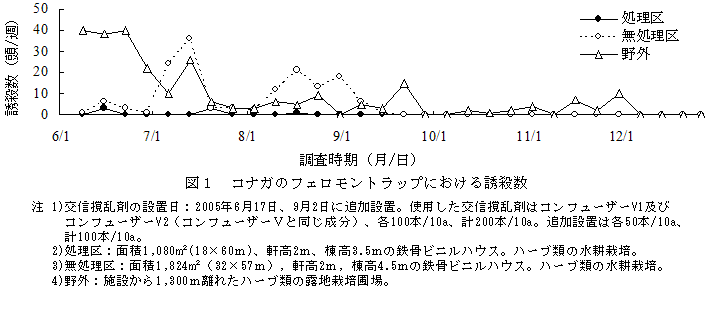 [キーワード]交信撹乱、性フェロモン、施設栽培、ハーブ類、コナガ、ハスモンヨトウ |