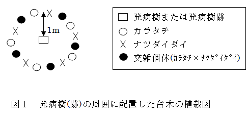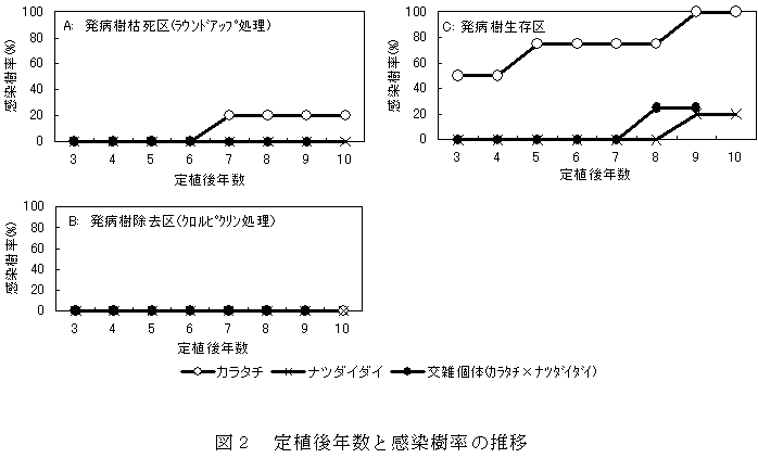 温州萎縮病が発症した株を抜根しクロルピクリン剤で土壌消毒すると、後作にカラタチを植栽しても、10年間は再感染が認められない。台木の種類では、ナツダイダイ及びカラタチ×ナツダイダイの交雑個体は、カラタチに比較して感染が遅れる。 | ||||||||||