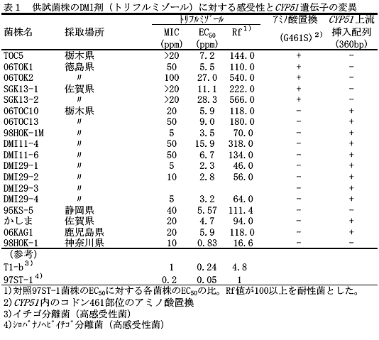 供試菌株のうち、DMI剤(トリフルミゾール)耐性イチゴうどんこ病菌TOC5、06TOK1、06TOK2、SGK13-1及びSGK13-2は、感受性菌98HOK-1との比較からCYP51 遺伝子に1塩基変異が存在する。この1塩基変異はコドン461部位にあたり、アミノ酸がG(グリシン)からS(セリン)に置換していると考えられる。 なお、DMI剤耐性イチゴうどんこ病菌には、CYP51 遺伝子に1塩基変異をもたず、CYP51 の上流に挿入配列が認められる菌株や挿入配列も認められない菌株がある(表1)。 |