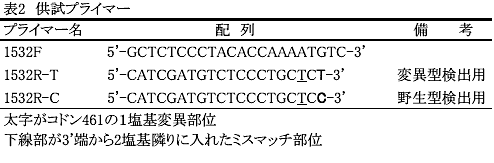 CYP51 遺伝子の1塩基変異を検出するためのプライマーは、田淵らの方法(特開2004-248635)に準じてリバースプライマーの3’端に変異部位をもち、さらに2塩基隣りに人為的に塩基置換を導入することでミスアニーリングを防ぐように設計する(表2)。このプライマー1532Fと1532R-T(変異型検出用)又は1532R-C(野生型検出用)を用いて、PCRの温度を94℃×1min、65℃×1min、72℃×1minで40サイクルとすることによって、CYP51 のコドン461に1塩基変異を伴う耐性菌(変異型)を検出できる(図1)。 |
