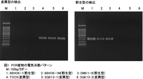 DMI剤耐性イチゴうどんこ病菌には、DMI剤標的酵素遺伝子(CYP51 )のコドン461に1塩基変異がある。そこで、これを検出するため設計したプライマーを用いてPCRすることで耐性菌を検出できる。 |