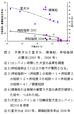 富山県では転作の主要作物として大豆を作付けしており、近年、品質の低下が著しい。その大きな要因はちりめんじわ粒の発生となっている。また、ちりめんじわ粒の発生については、地力の減耗、窒素吸収量の低下などが栽培要因としてあげられているが、一方、大豆コンバインによる収穫がやや遅れ気味であることが要因の1つと考えられる。 | ||||||||