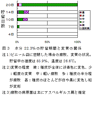 大豆品種「エンレイ」のちりめんじわ粒の発生を軽減するには、コンバイン収穫による刈り取り開始時期は、子実平均水分22%の頃である。また、子実平均水分22%程度の大豆の貯留限界は4日である。 | ||||||||