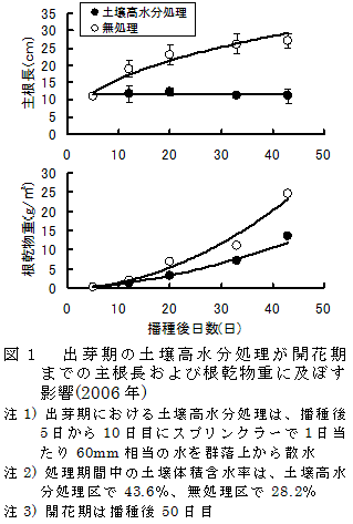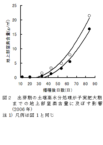 大豆の出芽期に湿害を受けると、開花期頃までの主根長は短くなり、根乾物重の増加が停滞するとともに子実肥大期頃までの地上部窒素含量が少なくなる。その結果、登熟後半の葉色の低下および落葉時期が早くなり、ちりめんじわ粒の発生が増加する。 | ||||||