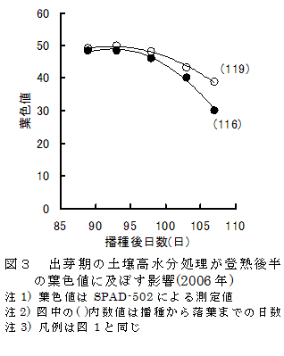 [キーワード]出芽期、湿害、根、窒素含量、葉色値、落葉期、ちりめんじわ粒、大豆 |