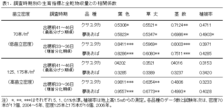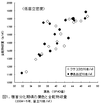 収量との相関の高さと測定の容易さから、いずれの品種とも苗立密度にかかわらず診断時期は穂首分化期頃が妥当で、診断指標として葉色(SPAD値)を用いることが適する(表1)。 |