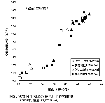 苗立密度70本/m2水準では穂首分化期頃の葉色(SPAD値)を44以上に、125~175本/m2水準では40以上を保つことにより、1700g/m2以上の黄熟期全乾物収量が得られる(図1、図2)。 |