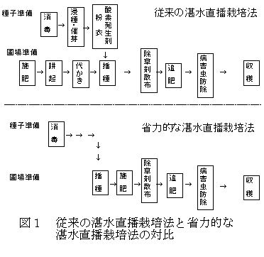 従来の湛水直播栽培における作業のうち、圃場準備作業から耕起、代かきの工程と、種子準備作業から浸種、催芽、酸素発生剤粉衣の工程を省略した栽培を行う(図1)。播種法は湛水状態での散播である。 |