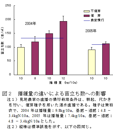 苗立ち数は、播種量が多くなると増加するが、催芽種子では10a当たり10kg以上で現地農家の直播の慣行(以下農家慣行)と同等の苗立ち数を確保できる。不催芽種子では苗立ち数が20~35%少なくなる(図2)。 |
