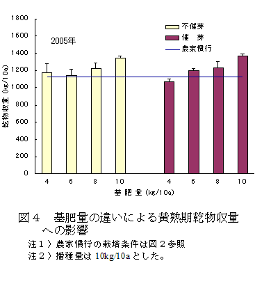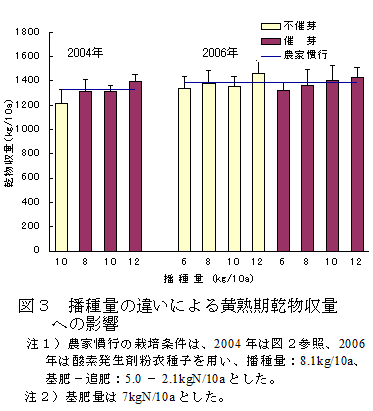 黄熟期の乾物収量は、不催芽種子では10a当たり10kgの播種量でもやや低くなることがあり、10a当たり12kg以上で農家慣行より高くなる。催芽種子では10a当たり8kgの播種量でとほぼ同等になる。(図3)。 |