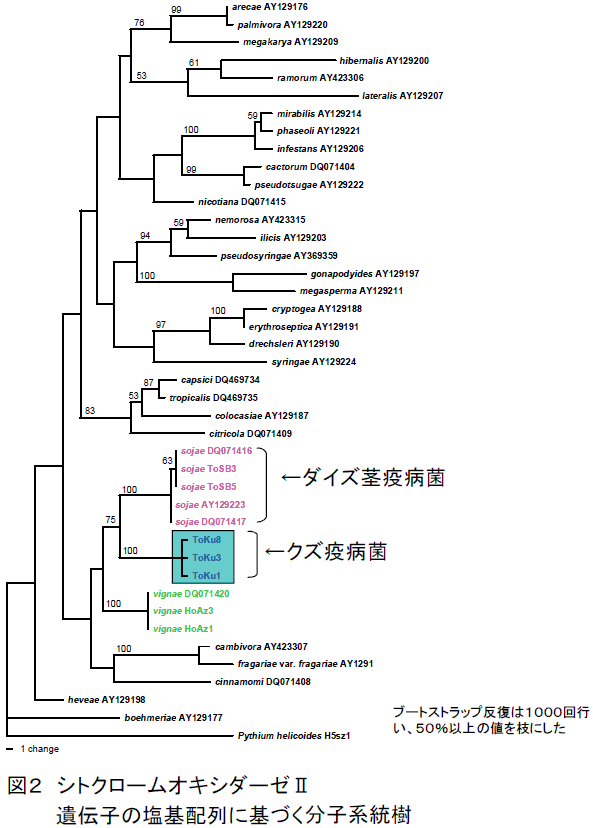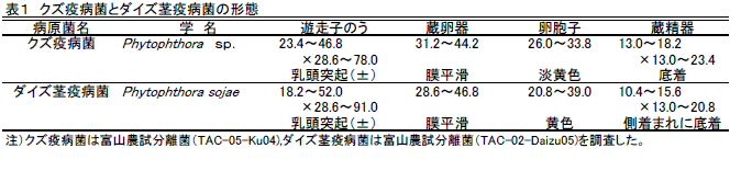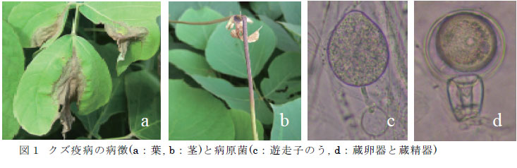 クズ疫病菌はダイズ茎疫病菌とは形態および分子系統群が異なり、新種のPhytophthora属菌である。ダイズ茎疫病菌とクズ疫病菌はそれぞれクズ、ダイズに病原性がある。 | ||||||||