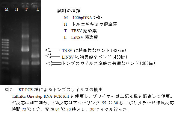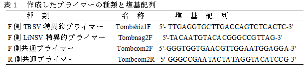 トルコギキョウに発生しているTomato bushy stunt virus (TBSV)とLisianthus necrotic stunt virus(LiNSV:仮称)の2種トンブスウイルスは、それぞれに対応するプライマーを用いたRT-PCR法による識別診断が可能である。 | ||||||