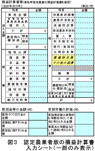 個人の農業者は、青色申告決算書のデータに経営者報酬等を追加することで(図3)、法人経営と同様の収支予測や財務分析が実施できる。 |