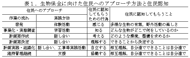 基本シナリオは、農家や地域住民等が、水路やその周囲で生き物の存在を感じ、どのような生き物がいるかを知り、生き物と水路の関係を考え、他人の意見を理解し、どのような行動を選択するかという住民認知の流れと、農業農村整備事業等の進め方が適合するように記載している(表1)。 |