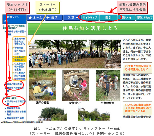 住民参加の段階(基本シナリオ)に沿ってストーリー(その時々に行う作業の目的や理由)と、ツール(その詳細な研究開発技術と実施方法、計102本)で構成され(図1)、場所設定、必要人数、所要時間、必要な用具、具体的な方法などが一目で分かるように収められてる。 |