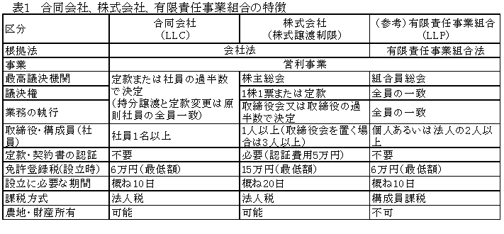 農業における合同会社(LLC)の類型と設立に当たっての特徴 |