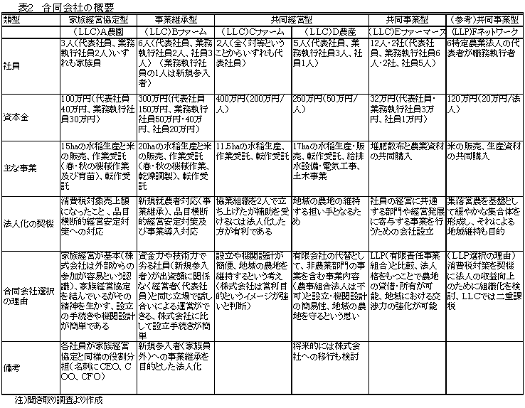 設立された合同会社は、家族経営協定の内容を定款に生かした家族経営協定型の合同会社(A農園)、新規参入者への事業継承を予定した事業継承型の合同会社(Bファーム)、複数の経営からなる共同経営型の合同会社(Cファーム、D農産)、構成員の経営発展を目的に一部分のみを事業化した共同事業型(Eファーマーズ)の合同会社など多様なタイプに区分できる。 |