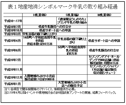 以下、取り組み事例では、飼料生産の拡大を契機に、乳業メーカー及び関係機関に地場産の粗飼料給与や生乳の生産地を特色とする牛乳の商品開発を要請する。県産農産物を積極的に扱う「県産サポート店」の登録を行い、商品容器に地産地消シンボルマークを記載する。容器版下の関係機関への協議や公取協議会への商標確認を経て、乳業メーカーが学校給食用牛乳の供給を開始する。その間にマスコミや地域広報を活用したPRを行い、半年以上経過してから、地域の地場産商品として、月に3万本のMB(メーカーブランド)商品を市販する。また、量販店からの誘因による取り組み事例では、同様な手続きを経て、月に10万本のPB(プライベートブランド)商品を市販する。(表1)。 |