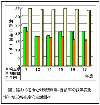 稲わらを含む地域別飼料自給率は、飼料イネの作付けが拡大してきた平成12年以降向上し、平成15年からは20.6%と都府県の15%を大きく上回り、ここ3年間の生産は飼料イネが全体の約5%を占め、地場産の粗飼料生産が拡大している(図1)。 |