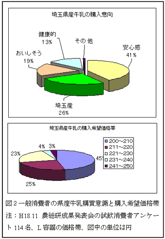 一般消費者への埼玉県産牛乳購買意識調査では、「安心感」41%、「埼玉産」26%となり、同様にL容器の購入価格希望では市販牛乳の1割高で購入が45%を占め、産地表示が求められている(図2) |