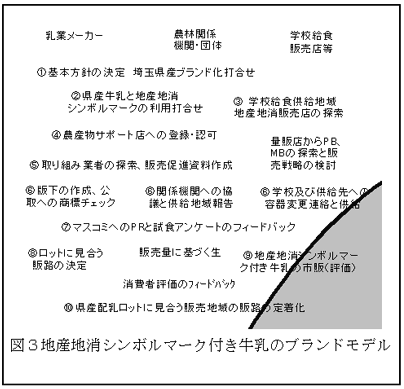 産地表示のない牛乳から、実需者・消費者への情報発信、ニーズにあった品質での安定供給、消費者の固定化を主な活動とする取り組み実証例を汎用化して、県産「地産地消シンボルマーク付き牛乳のブランドモデル」として図3にその概要を示す。 |