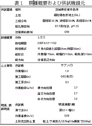 収穫時期が台風や長雨と重なることが多い茨城県利根川地域の露地レタス産地では、転換畑ほ場の傾斜化による排水対策が行われている。しかしながら、経年により圃場が不均一となった箇所を中心に滞水しやすく、平成16年の台風22、23号時などレタスがほ場滞水による湿害により収穫できない被害が発生しており、慣行作業として実施されているほ場傾斜方向に沿って心土破砕する方法では十分な排水性改善効果が得られない場合がある。そこで、農家が簡易に実行できる明渠と心土破砕と組み合わせた排水改善技術を確立する。 |