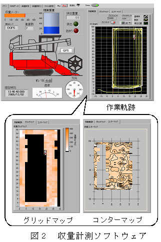 大豆用収量計測モニタリングシステムは、市販の大豆用コンバインに新たに追加した穀粒流量センサ、排出量センサ、GPS、運転席モニタおよびWindowsXPベースのコンピュータシステムをメインユニットとした計測装置で構成している(図1)。コンバイン背部に設置されたコンピュータ上で動作する収量計測ソフトウェア(図2)により、各種センサの情報を統合してリアルタイムに圃場内の収量マップを表示し、操舵ハンドル部に設置した運転席モニタにより簡易的な収穫情報を表示する。 |
