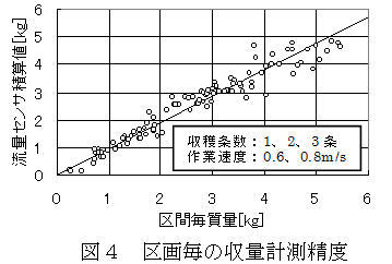 排出量センサにより、アンローダの排出時間を計測し、5%以内の精度でタンク内穀粒質量を推定する(H18年度成果情報)。排出毎に推定した質量と流量センサ積算値の比較を行うことで、収穫条件により異なる流量センサの校正式の補正を行う。10m区間毎に穀粒サンプリングを行った圃場収穫試験では、補正を行うことで流量センサの積算値の実質量に対する誤差の標準偏差は10.9%である(図4)。 |