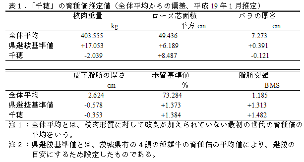 茨城県を代表する銘柄牛肉である「常陸牛」の生産を推進していく上で、能力の高い種雄牛の果たす役割は大きい。県有種雄牛として「北国7の8」の息牛である「茨北安」などを供用しているが、より高い肉質を期待できる「安福165の9」の息牛へのニーズが高い。そこで、県有の「安福165の9」息牛として実績のあった「安福秀」の全きょうだい弟である「千穂」の現場後代検定を実施し、育種価による遺伝的な能力の評価を行った。 | ||||||||||