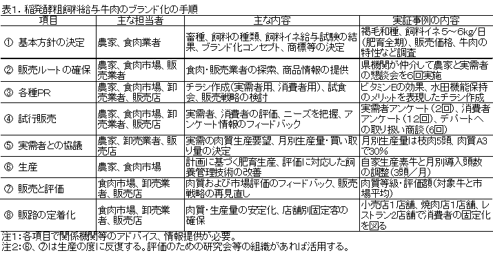 作成した手順(表1)は、過去の畜産物のブランド化の事例を参考に、実需者・消費者への情報発信、実需者への牛肉安定供給、市場評価に基づく牛肉生産技術の改善、消費者の固定化を主な活動とする一連の手順を整理している。 |