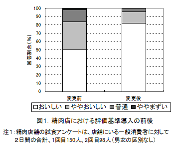 市場ニーズおよび市場評価に基づいた肥育技術の改善を図るため、牛肉の市場評価を農家にフィードバックするシステムとして、「彩の国肉牛銘柄化研究会」に加入し、市場評価を受け取ることが可能な毎月第一木曜日の出荷に変更している。さらに、農家は受け取った個体別の枝肉格付け情報と飼育経過の情報を照合し、飼料構成や給与量等を改善することで、肉質が安定化し、精肉店アンケートにおいておいしいと評価する割合が80%以上に向上している(図1)。 |