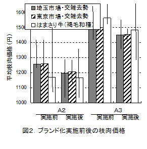 肥育技術の改善および実需者の認知度の高まりにより、価格帯で交雑種と競合する「はまさり牛」(褐毛和種)の市場評価が高まることにより、交雑種の平均枝肉価格と比較して、手順の実践によってA2格付けの枝肉では価格差が縮まり、A3格付けでは取り組み前と同様に安定した評価を得ている(図2)。 |