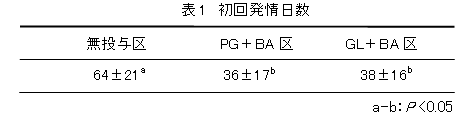 無投与区の初回発情日数は64±21日で、PG+BA区36±17日、GL+BA区38±16日と比較して遅延がみられ(P<0.05)、PG+BAおよびGL+BA投与はケトーシスに継発する初回発情日数の遅延予防に効果がある。(表1) |